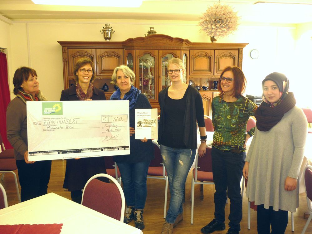 „Die ehrenamtlichen Mitglieder des Vereins ,Maranata' bieten Asylbewerberinnen und Asylbewerbern in den ersten Monaten ihres Aufenthalts Betreuung an. Deutschkurse sind zentraler Bestandteil dieser Hilfestellung. Mit unserer Spende kann der Verein für seinen Kurs ein gewisses Kontingent an Büchern kaufen", begründet die Landtagsabgeordnete von BÜNDNIS 90/DIE GRÜNEN Dorothea Frederking die Übergabe eines Schecks in Höhe von 500 Euro an den „Maranata Verein" (Stendal).