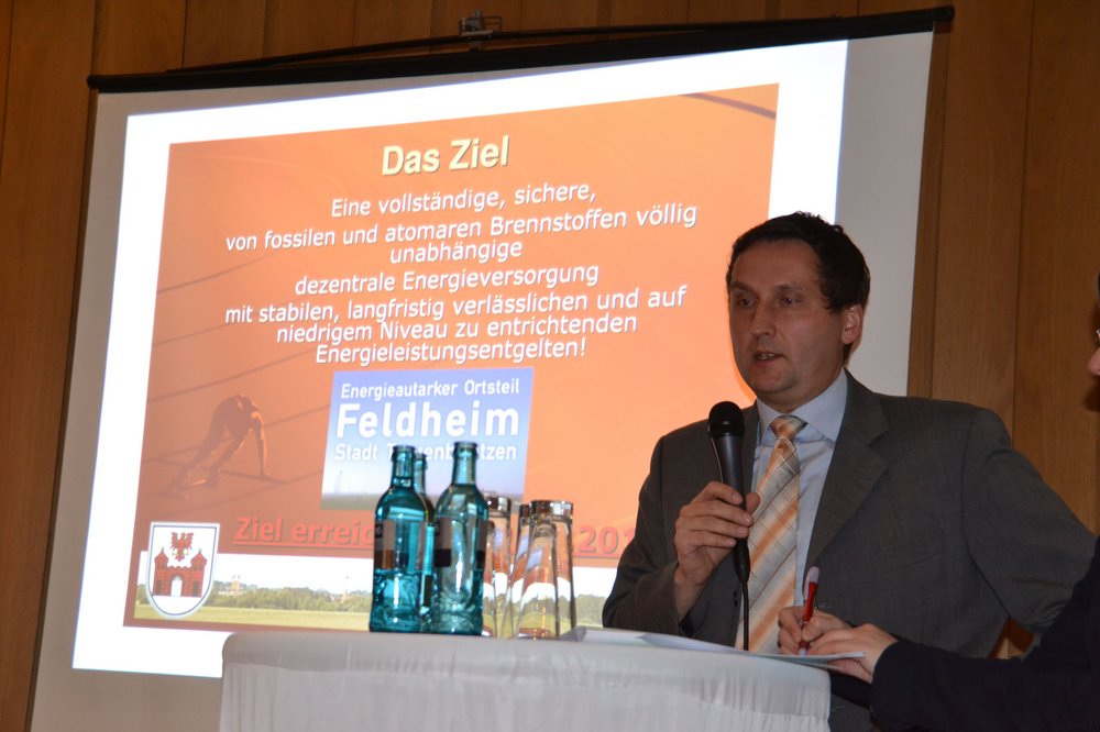 Der Bürgermeister der Stadt Treuenbrietzen mit ihrem Ortsteil Feldheim, Michael Knape, berichtete über die schon 2005 entstandene Idee, über Stromproduktion, Stromverteilung und Stromeinspeisung selbst zu entscheiden. Ziel sei es, eine völlig unabhängige, dezentrale Energieversorgung zu etablieren. Der direkt vermarktete Strom wird heute mit unschlagbar günstigen 16,6 Cent verkauft. Die Kommune will diesen Strom aus eigener Produktion sogar noch verdoppeln. Dies könne beispielsweise durch Repowering bestehender Windkraftanlagen gelingen.