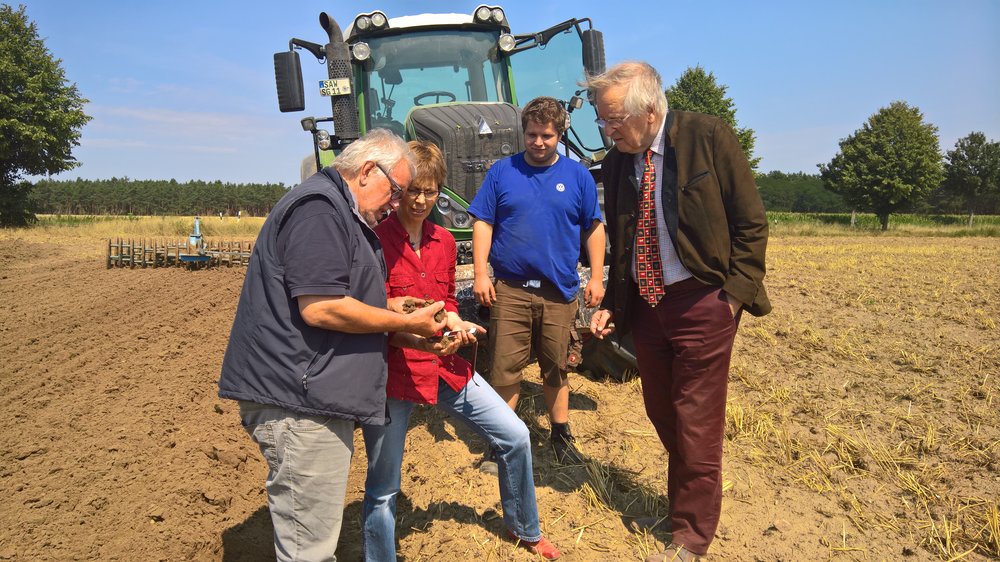 Frederking konnte erleichtert zur Kenntnis nehmen, dass trotz der dramatischen Dürre die Ernteeinbußen nicht so hoch sind wie bedauerlicherweise bei anderen Betrieben. „Die Ökoanbaumethoden scheinen auch wirksame Anpassungsmaßnahmen an den Klimawandel zu sein. Bei einer Feldbegehung konnte ich sehen, dass die Erde noch etwas feucht war, obwohl es seit Wochen nicht geregnet hat. Als Gründe für diesen relativ guten Bodenzustand wurde mir erläutert: zeitnahes Hacken zur Reduzierung der Verdunstung durch Unterbrechung der Wasserwegsamkeiten, umfangreiche Fruchtfolge und Einsatz von Festmist zum Aufbau einer satten Humusschicht, geringe Pflanzendichte.“