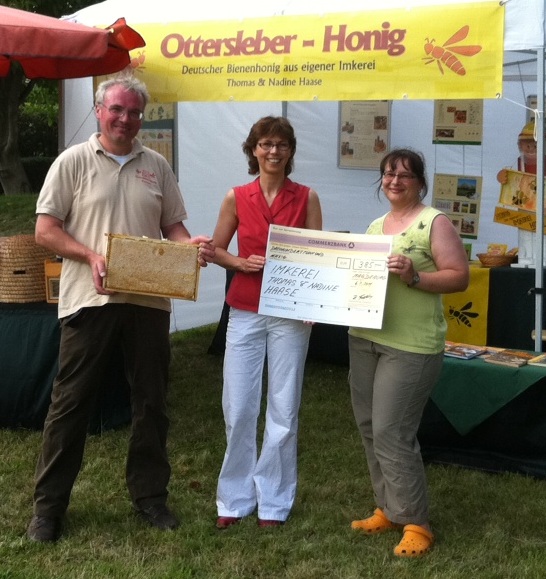 MAGDEBURG - Erfreut nahmen Nadine und Thomas Haase von der Imkerei Ottersleber-Honig am Tag der Deutschen Imkerei die finanzielle Unterstützung in Höhe von 385 Euro aus dem Aktionsfonds der Landtagsfraktion von BÜNDNIS 90/DIE GRÜNEN entgegen. Dieses Geld werden die beiden für ihre Öffentlichkeitsarbeit einsetzen.