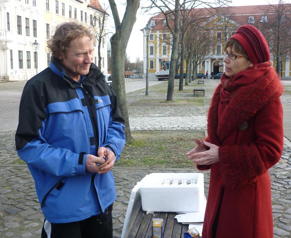 Dorothea Frederking wird am Samstag in Berlin mit einem Umhängeschild ebenfalls für eine Agrarwende demonstrieren. An der Groß-Demo „Wir haben es satt!“ nimmt Frederking bereits seit Jahren teil. Otto Schöneweis und Dorothea Frederking werden sich in Berlin bei der Demo wieder treffen und ihr Gespräch fortsetzen.