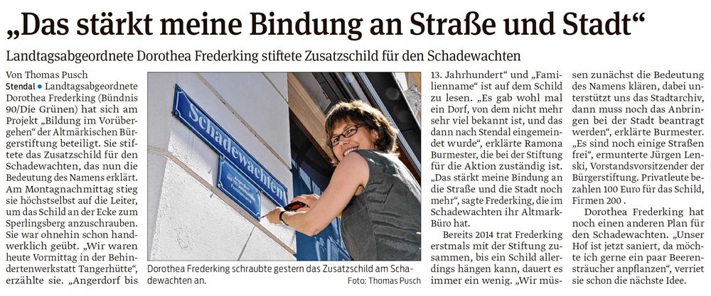 STENDAL. Unter dem Titel "Bildung im Vorübergehen" hat die Altmärkische Bürgerstiftung 2013 eine Daueraktion ins Leben gerufen, um Zusatzschilder an altmärkischen Straßen anzubringen, welche über die/den Namensgeber der Straße informieren. Über Spenden werden diese Zusatzschilder finanziert. Am 20.06.2016 brachte die altmärkische Landtagsabgeordnete Dorothea Frederking im Beisein von Jürgen Lenski und Ramona Burmester von der Bürgerstiftung Altmark ein von ihr gespendetes Zusatzschild für die Stendaler Straße "Schadewachten" an der Ecke zum Sperlingsberg an. Schadewachten ist auch die Straße, in der sich das Altmark-Büro der Politikerin von BÜNDNIS 90/DIE GRÜNEN befindet (Schadewachten 22a).