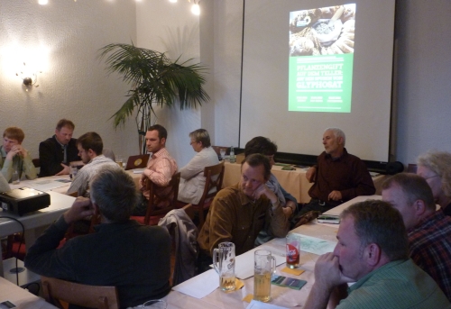 Jürgen Hartmann (Verbund Ökohöfe e.V. Sachsen-Anhalt) präsentierte Alternativen zum Glyphosateinsatz und stellte die im Ökolandbau hauptsächlich eingesetzten mechanischen Maßnahmen wie Grubbern und Striegeln in den Vordergrund. Dagegen ging Thorsten Breitschuh (Bauernverband Sachsen-Anhalt e.V.) auf die Nachteile dieser mechanischen Verfahren ein: mehr Treibstoff für schwere Landmaschinen, mehr Aufwand bei der Reinigung des Erntegutes, höhere Personalkosten. Seinen Angaben zu Folge ist Glyphosat in der sachsen-anhaltischen Landwirtschaft der drittwichtigste chemische Wirkstoff.