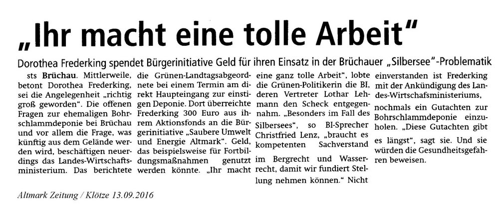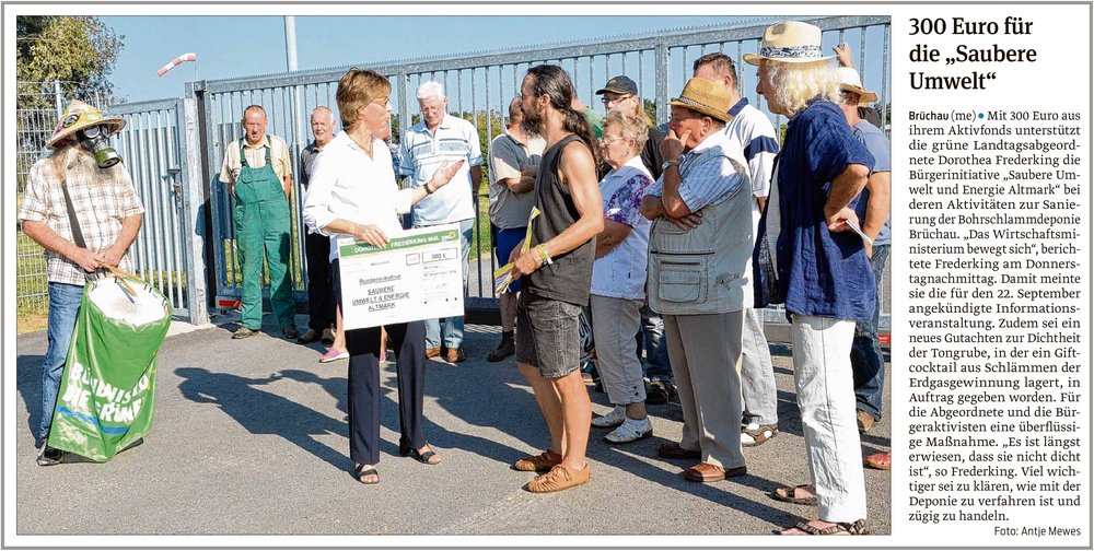 Ich kenne die Bürgerinitiative (BI) seit Jahren. Sie leistet eine wertvolle Arbeit, die ich gerne finanziell unterstützen möchte. Die BI thematisiert wichtige umweltrelevante Aspekte und erarbeitet gemeinsam mit den Verantwortungsträgern neue Wege für eine lebenswerte Altmark. Beispielhaft zu nennen sind: der Widerstand gegen die inzwischen bei Maxdorf abgebaute Kohlendioxidverpressungsanlage, die Aufklärungsarbeit zum Fracking von Erdgas und die Gründung einer Energiegenossenschaft. Seit rund einem Jahr drängen die BI, kommunale Vertreter wie der Bürgermeister von Kalbe (Milde) und der Ortschaftsrat von Kakerbeck, der grüne Kreisverband von Salzwedel und ich auf eine Lösung für die Bohrschlammdeponie Brüchau.